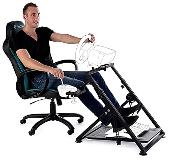 In diesem fall sitzen sie auf ihrem bereits vorhandenen gaming stuhl und stellen ein gestell mit dem montierten lenkrad und den pedalen vor sich auf.